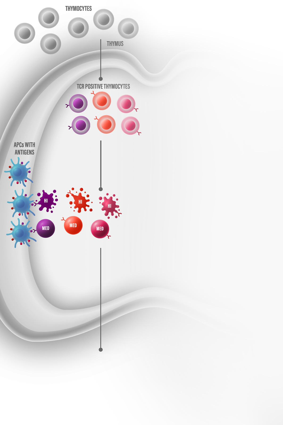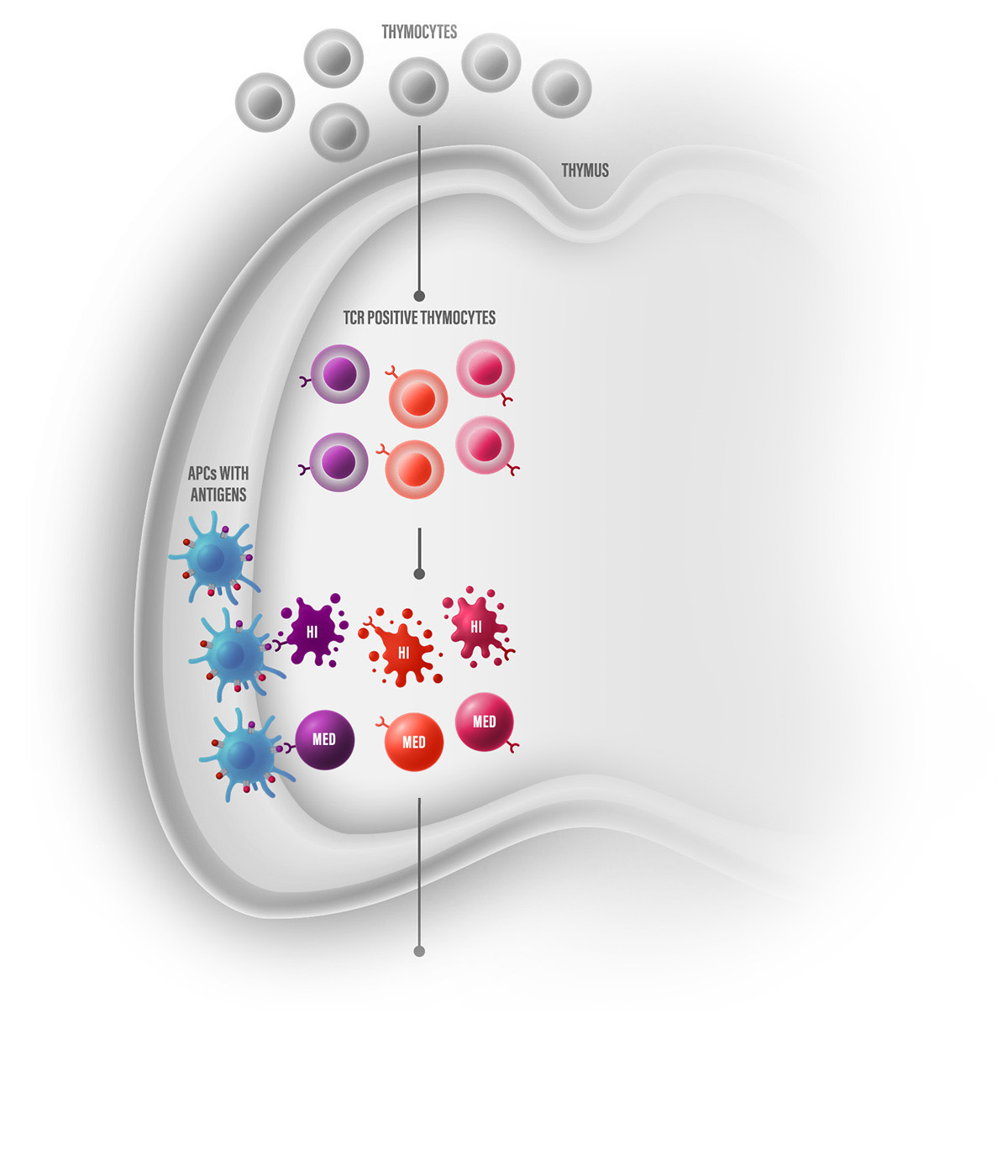 Antigen-presenting cells (APCs) display self-antigens that engage TCRs on developing T cells. High-affinity recognition between a self-antigen and TCR promotes deletion of potentially autoreactive T cells. Medium (MED) affinity recognition promotes differentiation into tolerogenic Tregs that recognize and protect tissues bearing self-antigens.